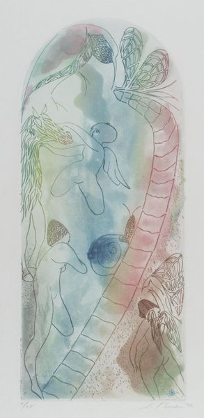Luchita Hurtado made this untitled artwork with blue paint or ink, and I can see how the liquid seeped and spread across the page. The whole thing is awash in turquoise-y blues, making me think of underwater spaces, like Hurtado’s holding her breath and painting from the depths. The figure is almost like an x-ray, bones and organs emerging from the blue. It's like she's mapped a body, and the watery paint gives it a kind of dissolving, ephemeral feel. The figure spreads their arms out, mirroring the shape of the torso and legs beneath. The texture of the paint isn't dense or heavy. It’s more about letting the medium do its thing, creating those blurry edges where the colors meet and mingle. This reminds me a little of Etel Adnan's paintings, the way she used color to evoke landscapes and emotional states, but with Hurtado, there's this ghostly human presence. It’s a reminder that art isn’t about answers but about exploring different ways of seeing and feeling.