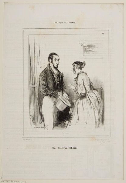 Editor: Here we have Paul Gavarni's "Costumes of the Countryside." It depicts a man and woman in what appears to be formal attire, yet the title suggests something different. What can you tell me about it? Curator: Gavarni's lithograph, though seemingly a simple portrait, reflects a complex social commentary. How do these "costumes" reinforce or challenge the rigid class structures of 19th-century France? Consider the performative aspect of dress and its role in defining gender and social identity. Editor: So, the "costumes" are like a mask? Curator: Precisely. They hint at the artificiality of social roles. How might Gavarni be critiquing the idealized image of rural life versus its lived reality for women? Editor: I hadn't thought about it that way. It’s more than just a pretty picture. Curator: Exactly! Art often serves as a mirror reflecting societal tensions and power dynamics, inviting us to question the very fabric of our own assumptions.