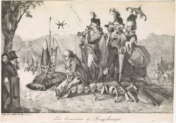 Curator: What a darkly humorous scene! The figures perched atop the crawfish in Delacroix's "Crawfish at Longchamps" seem plucked from a satire. Editor: It feels very political, doesn't it? The Longchamps referenced in the title was known as a place of display for the elite. The crawfish is a crude vehicle, transporting figures of power. Curator: The lithographic medium really enhances the biting quality. Look at how Delacroix uses shadow and detail to caricature these figures. What symbols are at play here? Editor: I see a flag bearing scissors, perhaps a mocking symbol of cutting ties with tradition? The artist uses the comical to expose the excesses of the aristocracy, creating space for dissent. Curator: There's a definite sense of societal unraveling here. Yet, by depicting them in this absurd tableau, Delacroix perhaps suggests a deeper, almost mythic dimension to their folly. Editor: It's a compelling critique, delivered with a sardonic wit. This work encourages us to re-evaluate how power operates and is maintained through performative displays of wealth. Curator: This reminds me that symbols can be both potent and precarious, reflecting the shifting sands of cultural memory. Editor: Yes, and how art can serve as a powerful form of resistance by skewering the establishment.