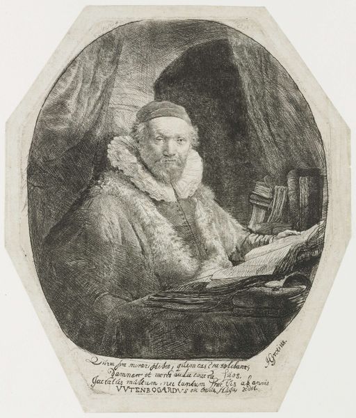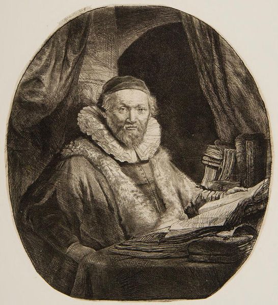 Curator: Here we have a print titled "Jan Uytenbogaert, preacher of the Remonstrants," made around 1635. It’s housed here at the Rijksmuseum. What's your first impression? Editor: You know, it feels like peering into a little world, doesn't it? The way he’s hunched over his books gives a real sense of quiet concentration... and also like he's got secrets he's not sharing! Curator: Absolutely. Observe how the artist employs dense cross-hatching to define the figure and the cascading drapery in the background. This print is an excellent example of how printmaking can achieve remarkable textural complexity. Note also the play of light and shadow, lending both depth and dimension to this work. Editor: It's almost as if the light is thinking, too, you know? Considering. Is that the guy's collar threatening to overwhelm him, or is it giving him power? Curator: The ruff, typical of the period, is a powerful symbol of status and refinement, though here it’s rendered with so much detail, it almost seems to physically confine him, underscoring his scholarly focus. Note the inscribed text below the image. The text includes Latin verses praising Uytenbogaert, aligning the image with humanist traditions. Editor: That's quite an inscription! Like a secret code we need to crack. You can almost hear the scratching of the pen as they were carved in, imagine them creating it by candlelight in a studio somewhere, years ago. Curator: Indeed. The artist demonstrates skillful use of line weight to emphasize the subject’s features and clothing. By analyzing the linear construction, we see how the composition leads the eye from the preacher’s face, down to his hands, and across the cluttered tabletop, drawing viewers into his world of study and contemplation. Editor: He certainly has that faraway gaze. Thinking. Reflecting. What was he reflecting *about,* though? Sermons? Life's big mysteries? Did he have a hot date that evening? Ah, who knows what secrets a portrait like this keeps! Curator: It is these intricacies, of course, that provide for sustained interpretive exploration of its subject and style. It brings together historical record and artistic practice, reminding us of printmaking’s pivotal role in early modern European visual culture. Editor: Yes. Well said! Thanks for guiding my reflections today. This thoughtful exploration helps us connect with this work in a much richer way.
