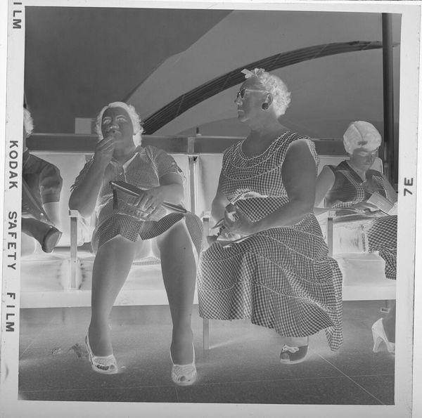 Curator: Here we have an untitled photograph by Jack Gould, currently held in the Harvard Art Museums collection. My immediate impression is the strong geometric balance achieved through the subjects' placement. Editor: The image reverberates with mid-century anxieties, does it not? The act of eating, normally so comforting, feels almost defiant here, a small rebellion against the pressures of travel and societal expectations. Curator: I'm interested in how the stark contrast enhances the form. Note how the inverted tones create an almost graphic quality, emphasizing the linear arrangement of the women and the planes of the seating area. Editor: Absolutely. The composition is pregnant with meaning. The women themselves, archetypes of their time, speak to a larger narrative of societal roles. Look at the way they are all facing forward, as if they are ready to be sent somewhere. Curator: Yes, the way the artist used the photographic medium is superb, creating depth and texture. A close look reveals his understanding of light and shadow to create dimensionality. Editor: Indeed. This small image functions almost as a mirror, reflecting back at us a particular moment in time and the ever-present anxieties of the human condition. Curator: It’s remarkable how Gould's technical choices amplify the emotional core of the scene. Editor: A resonant exploration of both the individual and the collective experience, wouldn't you agree?