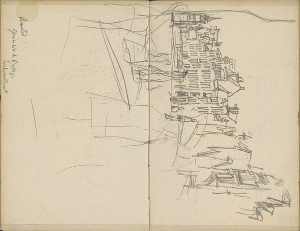 Editor: So, this is George Hendrik Breitner's "View of the Houses on the Vijgendam and Beursstraat (Rokin) in Amsterdam," made around 1902. It's a pencil drawing on paper. I'm struck by its casualness, like a snapshot capturing a moment in time. What do you see in this piece? Curator: Beyond its immediate aesthetic appeal as an Impressionistic cityscape, I see a powerful document of urban life at the turn of the century. Breitner was known for capturing the gritty reality of Amsterdam, and this sketch offers a glimpse into the city's transformation amid industrialization. Notice the stark contrast between the imposing architecture and the everyday life implied by the fleeting sketch. How do you think Breitner's choice to sketch, rather than create a formal painting, reflects his view of the city? Editor: That’s a great point! Perhaps the sketch format is meant to highlight the fleeting nature of modern urban experience. I guess that elevates the importance of the moment. The fleeting quality also reinforces a sense of democratization, documenting experiences for everyone, rather than staged historical or mythological settings. Curator: Exactly! And let's consider the location. The Rokin was a bustling hub of commerce and social activity. Breitner is not just depicting buildings, but he's implicitly commenting on capitalism, class, and the changing social landscape of Amsterdam. Do you see anything in the composition that strengthens this idea? Editor: Maybe the way the buildings seem to loom over the street, like they're imposing themselves onto the lives of ordinary people. It kind of gives off this feeling of capital's omnipresence, like we always have to answer to someone. Curator: Precisely! It is this constant presence in daily life. This interpretation reveals how Breitner's work transcends a mere cityscape. It's an activist stance, questioning power dynamics and social structures. Thinking about that changes your reading of it, right? Editor: Definitely! It’s more than just a pretty picture; it's a social commentary. Thanks for helping me understand it! Curator: It's a collaborative process. Considering the artwork’s cultural contexts, particularly the rise of industrialization and concurrent shifts in economic paradigms, brings fresh life to our reading of an artwork.