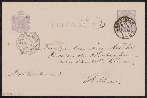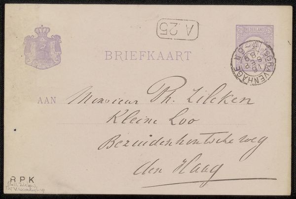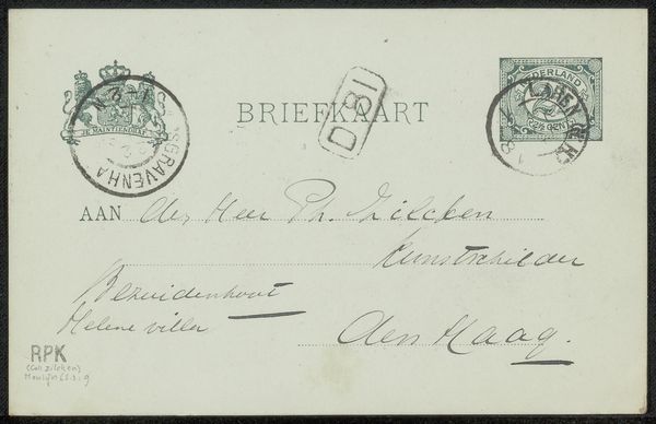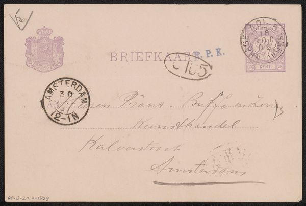Curator: This drawing is titled "Briefkaart aan Philip Zilcken," and was created by Wally Moes before 1894, employing ink on paper. It is a postcard addressed to the artist Philip Zilcken. My first thought? A rather impersonal art form, though not unexpected for the time! Editor: The formality and precision here intrigue me. This piece, more than simply conveying a message, provides an intimate insight into the Dutch art world's social networks and communication practices during this late 19th century period. It’s almost like a glimpse into the lives of these artists. Curator: Yes, notice how Moes prioritizes elegant, legible script; her artistic labor here resides less in conventional pictorial language and more in careful calligraphy. There’s a certain compositional rigor; it isn’t only about neat handwriting, is it? The carefully considered balance of stamped seals and handwritten text works to achieve a particular type of artistic harmony. Editor: Considering the time this postcard was likely sent, imagine what those communication channels represented to marginalized figures - queer or female artists for example! Access to a network became vital in an era when art spaces were predominately occupied by male artists and tastemakers. Epistolary pieces like this reflect complex webs of professional connections within cultural spheres... Curator: Very interesting points, for sure. I still tend to look at it aesthetically. The postmarks and stamps introduce layers of texture and visual depth that, to my eyes, enhance this sense of graphic art and structure. It isn’t *just* communication, I guess, but aesthetic language of its time… Editor: True enough. But when situating a seemingly innocuous piece like this, let’s say in a discussion of women artists in the Dutch Golden Age, you can start thinking about hidden politics! It’s almost a protest – quiet though it might be, by refusing conventional gender roles. The simple act of maintaining such correspondences challenged established norms! Curator: So we started with this understated, unassuming little artwork that might initially strike someone as rather mundane. Editor: But looking closer, it turns out to offer a glimpse into broader histories of both personal expression and the social life of artists.