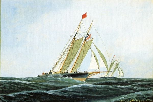 Curator: Before us is Antonio Jacobsen’s oil painting, "Vision and Dauntless off Sandy Hook Lightship," created in 1876. The canvas captures two boats amidst choppy seas, with the lightship looming in the background. What strikes you initially about this maritime scene? Editor: The intensity of the waves definitely grabs me first. There's a real sense of movement, and perhaps a bit of struggle, between these man-made vessels and the raw power of nature. You can almost feel the boats pitching and rolling. Curator: Jacobsen specialized in ship portraits, and this piece offers a glimpse into the maritime world of the late 19th century, highlighting advancements in shipbuilding. The presence of the lightship, essential for navigation, speaks volumes about the era’s growing global trade and the importance of safe passage. Editor: It makes me think about who had access to these boats, and the labor that went into building and sailing them. Maritime history often romanticizes exploration and trade, but what about the exploitation and displacement that often accompanied it? Where do these grand images fit into the bigger picture of that social hierarchy? Curator: Precisely, looking closely at Jacobsen’s technique we see an intriguing contrast. His meticulous detail in rendering the ships – the sails, the rigging – juxtaposed with the somewhat less refined portrayal of the water and sky, offers insight into what he considered of utmost importance. The vessels themselves take center stage, literally and metaphorically. Editor: Absolutely. And who commissioned these works? Whose stories were being amplified, and whose were being silenced or forgotten in the artistic records? Were there marginalized voices or perspectives tied to this piece or moment? Curator: It’s crucial to ask those questions. Examining paintings such as these critically, with an eye to social dynamics, is important, because art both reflects and shapes cultural values, influencing how we perceive history and our place within it. Editor: For me, I’m walking away with a more nuanced perspective, really grappling with both the undeniable allure and also the historical and societal impact these sorts of ships may have left behind. Curator: A dual understanding, that's a fitting end to this contemplation. Art offers more than aesthetic appeal; it provokes critical thinking about the world, past and present.