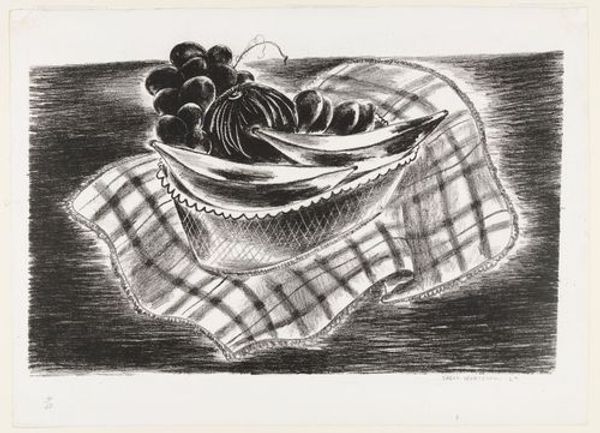 Editor: Here we have Yasuo Kuniyoshi’s "Pretzels," a graphite drawing created in 1927. It strikes me as an unusual still life, a kind of austere and almost unsettling depiction of everyday objects. What do you see in this piece? Curator: I see a potent intersection of immigrant experience and artistic modernism. Kuniyoshi, a Japanese immigrant to the US, often imbued his work with a sense of displacement and a questioning of belonging. Notice how the pretzels, grapes, and what appears to be a tin of some kind are rendered with such sharp focus against the vast landscape in the background? Editor: Yes, the contrast between the detailed foreground and the rather bleak, almost desolate landscape is striking. Curator: Precisely. This juxtaposition, rendered in such stark monochrome, evokes a sense of isolation. Kuniyoshi arrived in the US amidst rising anti-immigrant sentiment. This could be a commentary on the experience of being a foreigner, of the still life of trying to establish and nourish a new life while set against an often unwelcoming backdrop. Editor: That’s a fascinating interpretation! The objects themselves, then, might represent elements of American culture and sustenance within this experience? Curator: Exactly. Even the choice of pretzels – a traditionally German-American snack – might subtly hint at the complexities of cultural assimilation. How might his personal history play a role here? Editor: That completely reshapes how I see the drawing. Before, I just saw an odd still life. Now, I see a statement about cultural identity and the immigrant experience. Curator: And that's the power of art, isn't it? It invites us to look beyond the surface and consider the social, political, and personal forces that shape our world and our perceptions of it.
