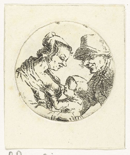 Curator: Immediately, I’m struck by the intimacy of this scene. It feels like eavesdropping on a very private moment. Editor: Indeed. Here we have "Man en vrouw in gesprek" or “Man and Woman Conversing,” an etching dating sometime between 1756 and 1817, crafted by Louis Bernard Coclers. I’m especially interested in its materiality – the choice of etching, a relatively accessible medium at the time, suggests a potential for wider distribution of this genre scene. Curator: Absolutely. There’s something so raw about the lines, wouldn’t you agree? As though it captures the fleeting nature of gossip. Their faces are so close; you can almost hear the whispered secrets, anxieties maybe. The swirling darkness above them feels like the weight of their confession or plans. Editor: That's interesting, that idea of "confession." Etching itself is a revealing process. The artist lays bare his design by exposing the metal plate to acid, wearing away the surface to create the lines. Coclers seems particularly focused on surface too, even their dress and the textures are sharply emphasized as elements with particular weight in representing status. Curator: Yes, you’re right, and those meticulously etched costumes almost distract me, momentarily. But the eye always returns to the faces. I wonder what troubles their gaze? This is beyond a mere 'genre scene;' to me it mirrors a deep human yearning, a search to feel acknowledged, isn't it? It is like their whispers could change their fortunes. Editor: Maybe, though I am not quite convinced that these sort of human interactions would influence more practical or societal things for these characters. Still, considering the probable consumption of prints during this period – their purchase, display, and circulation – it's not hard to think that the artist considered making works that have a common and immediate attraction. This allowed, probably, the etching's widespread viewing, engaging diverse classes with those scenes. Curator: I see your point, that tension between the public nature of a print and this incredibly private moment. A wonderful push and pull. It definitely adds to my fascination with it, really a captivating, beautiful composition, particularly considering the material used. Editor: I agree. By bringing art and the everyday, "high" and "low" materials together in this dialogue of production, Coclers shows us that access and affordability do not lessen artistry's value, but democratize its reach, making people reflect through common images and themes, and also in very intimate ways.