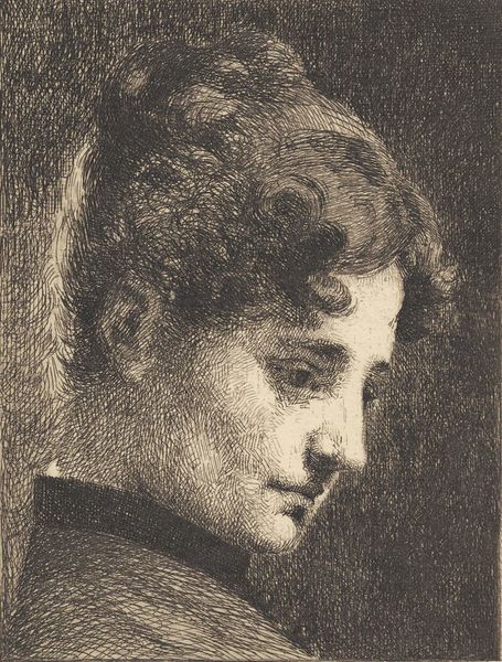 Curator: Rossetti's 1867 pencil portrait, titled "Ellen Smith," offers a fascinating glimpse into Pre-Raphaelite aesthetics. What strikes you initially? Editor: The softness, undeniably. It's almost dreamlike in its hazy edges. There's an inherent intimacy because the gaze is averted. What is the story behind this figure? Curator: Ellen Smith was one of Rossetti's models. The artwork situates her within the Pre-Raphaelite's fascination with feminine beauty, and her red hair was likely meant to tie to his muse, Elizabeth Siddal. However, this work should not be seen just through the eyes of male desire. Ellen looks intelligent and rather detached from her representation. The question arises, to what degree did she engage, or perhaps even resist, this romantic idealization? Editor: True, her gaze hints at a mind of her own. Looking at the technique, note how Rossetti uses line to create volume, yet the contours remain surprisingly indistinct, enhancing that dreamy quality. This, along with the subtle shading of her features and neck, helps bring out this face. I'm intrigued by that minimal rendering. How does this align with or depart from traditional portraiture? Curator: Portraiture at this time often served to elevate the subject’s status and virtue. Rossetti certainly plays with this convention. It can be read in relation to the political movement that promoted the emancipation of women and called for better access to education for them. The artist might offer some insights to his patron through this aesthetic lens. The delicate nature of the pencil medium underscores a certain vulnerability. Editor: And the composition—the subject almost fills the entire space, with just the simple high collar dress visible. It focuses our attention solely on her face and that slightly enigmatic expression. Curator: Precisely. It prompts us to consider the artist’s choice to represent the model as an individual, while situating her within the prevailing aesthetic ideals. It invites questions about agency, representation, and the negotiation of identity in art. Editor: It seems that every element—composition, the medium, line quality— serves the emotional charge of romanticism that defines Rossetti's practice. Ultimately, Ellen remains both present and elusive. Curator: Her presence indeed lingers. The gaze has staying power.
