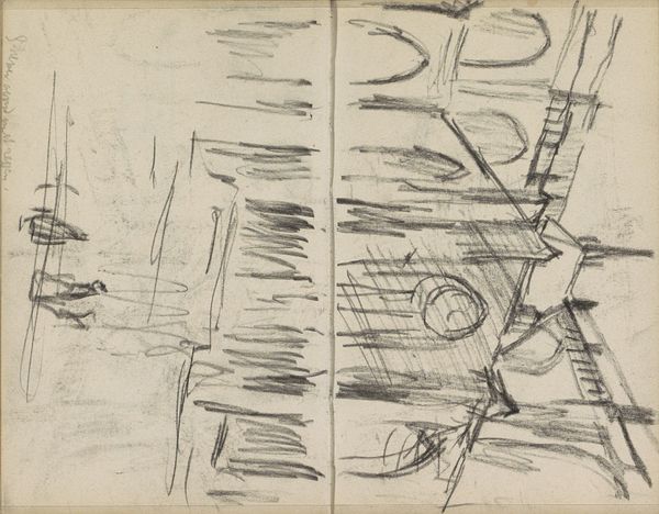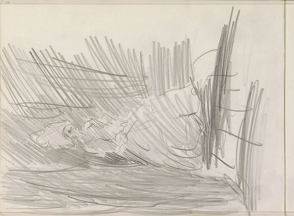 Curator: Alexander Shilling created this pencil drawing, "Figuren op een jaagpad," in 1908. Looking at it, what's your initial impression? Editor: It feels like a fleeting moment captured. The swift, almost frantic, lines suggest a scene glimpsed from a moving train. There's a rawness and immediacy that’s very appealing. Curator: Indeed. The work comes from a pivotal period in European history. It reflects broader cultural anxieties about modernity. One has to consider the Industrial Revolution and the rapid urbanization of the era, influencing artistic perspectives, towards the relationship of landscape and the society within. Editor: I find it curious that it only captures only the slightest traces of society itself. Those shadowy, almost indistinct figures in the middle, they are hard to decipher. The overwhelming element is the depiction of landscape. One can almost taste the raw dampness in the air. Do you think this is supposed to function as a statement on industrial encroachment? Curator: The path itself, the “jaagpad”, or towpath, was constructed and is evidence of it, it’s literally built into the land. So I feel it is important to address the complicated relationship society had with industry. Shilling’s choice to focus on it rather than exclude its existence altogether shows an intersectional dynamic within it. One may observe and consider Shilling’s choices. Editor: I see your point. This piece reminds us of the subjective way any reality, be it pastoral or otherwise, is portrayed, isn’t necessarily objective. Perhaps the sketchbook format also reinforces this feeling, portraying it as a private, personal experience, shaped by memory and mood rather than pure observation. Curator: It certainly makes me reconsider my approach and what it means to display the work, a peek at a memory of Shilling’s. It makes me wonder, are we truly observers if we were to superimpose our expectations onto a place and society that may never have been ours to begin with? Editor: Absolutely. And by framing it as a subjective rendering, rather than objective, Shilling challenges us to bring our own experiences to the table, doesn't it? It invites a dialogue between his experience and ours. Curator: Yes, exactly. And looking at this sketch today, over a century later, in a time of renewed anxieties, the message remains poignantly relevant, calling upon viewers to engage actively with his perspective and with the scene. Editor: I completely agree. It really speaks volumes about how a landscape carries layered historical significance.