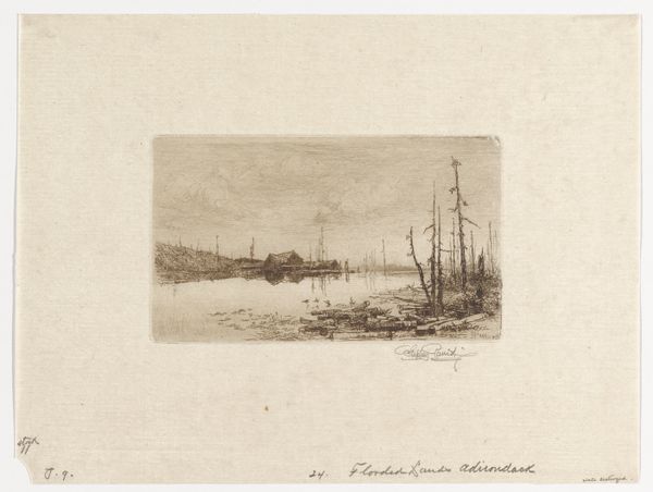 Charles Adams Platt created this etching of the Annapolis River. Platt, an American artist born in 1861, worked during a period of significant industrial and urban expansion in the United States. Consider the Hudson River School painters who came before him, and their romantic portrayal of the American landscape as sublime and untouched. Platt turns to Europe, where he studied. The aesthetic, seen here in the monochromatic and miniature scale of the etching, embodies a different sensibility. The etching medium, with its fine lines, allows for a detailed depiction of the natural scenery, yet the overall effect is intimate rather than grandiose. There is a nostalgic longing, a yearning to capture a fleeting moment in time. The work then becomes not just a visual record but an emotional experience. It encourages a personal reflection on time, place, and memory.