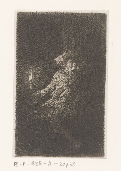 Curator: This etching by Charles Jacque from 1842, titled "Rokende man in kelder bij kaarslicht," which translates to "Smoking Man in Cellar by Candlelight," plunges us into a dimly lit interior. What is your immediate reaction? Editor: The stark contrasts immediately grab you. The heavy use of dark lines really sets a somber mood, but there's an intimacy, a focus on the texture of the light playing on the figure. Curator: Jacque, a student of Paul Delaroche, demonstrates an interesting approach to chiaroscuro, heavily influenced by the Baroque masters. His interest in peasant life and military scenes clearly emerges during this period of intense social change across Europe. Do you feel this scene has anything to say about social inequality? Editor: The diagonal lines really lead the eye to the candle and then up to the subject's face. His gaze looks away from us, adding an air of mystery. This close focus seems less about any larger political statement, but, given that, the setting and character’s garments do raise questions. Curator: Indeed. He’s depicted in what could be period attire, reminiscent of historical military garb, possibly referencing social status while the cellar suggests hidden histories or underground activity. But what about that stark darkness and then small flicker of light? Editor: This use of chiaroscuro is wonderful and it almost feels staged. It seems Jacque wasn’t afraid to play with the possibilities of what the interplay between darkness and light could add. I love how you can trace the texture of those strokes that he employs to generate depth and emotion. Curator: Jacque would go on to great success, painting large pastoral landscapes for the French upper class. Perhaps this etching provides a critical lens through which to understand his broader social perspective. Editor: For me, it comes down to how light is depicted as a tactile element within an atmospheric void. That contrast is so memorable. Curator: An atmospheric work with a historical bent indeed, which speaks to us today from within the shadowed corners of the past. Editor: It definitely is. It also shows the possibilities of etching; here, chiaroscuro demonstrates the ability to play around with dramatic potential.