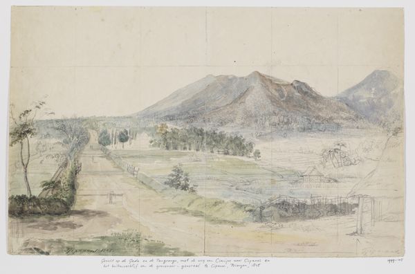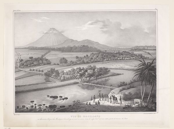 Curator: Let’s turn our attention to “Landschap bij de berg Tidar op Java,” a compelling landscape rendering created around 1833 by Wilhelmus van Groenewoud. It’s currently part of the Rijksmuseum’s collection. The artwork, realized through engraving techniques, presents a sweeping view. Editor: My first impression is one of distance. The gradations of gray generate an atmospheric effect, softening what could be severe topographical forms, almost beckoning the viewer into the scene. It's balanced, yet vast. Curator: Indeed. Van Groenewoud’s strategic use of line work gives the landscape its inherent structure. The peaks, while distant, provide a structural anchor, and the foreground trees on the right act as a visual counterweight. The subtle tonality creates layers, leading the eye across the composition. Editor: And I’d add that those majestic volcanoes resonate profoundly within Javanese cosmology. Mountains are often imbued with spiritual significance, seen as the abode of deities and ancestors, influencing fertility and well-being. Note the small figures in the foreground—seemingly dwarfed by the immensity of the landscape, perhaps evoking the power of the land itself. Curator: A point well taken! The figures do introduce a human element, serving almost as scale indicators but not quite. This slightly disorienting sense is part of what makes this engraving so intriguing to analyze purely on a formal level. Consider, also, how the use of hatching and cross-hatching defines texture and form. The lines contribute to a sense of organic movement in the foliage and topographical structure, all done without any need for vibrant hues. Editor: Exactly. That movement, in tandem with the two mountains on the background could also symbolize dualism and harmony between the earth and the cosmos which goes very far back in Javanese ancestral traditions. Perhaps, this European artist found himself inspired by the weight of all those cultural associations while creating this print. Curator: A fascinating perspective – perhaps a bridge where formal technique meets enduring symbolism! Editor: An evocative glimpse of how cultures intersect.