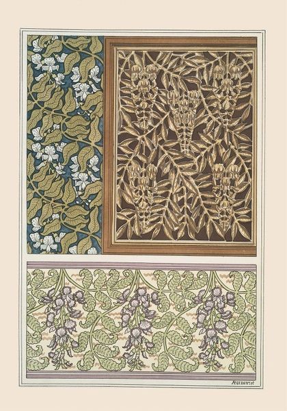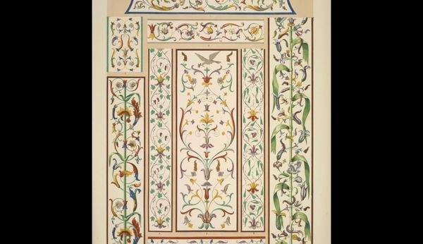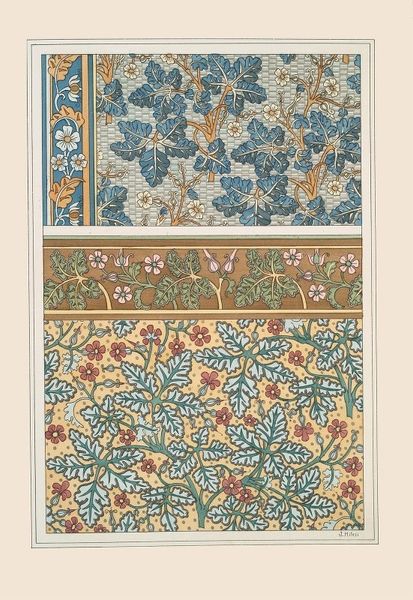 Editor: This is a drawing titled "Medieval Ornament no. 1. Conventional leaves and flowers from illuminated manuscript," and is attributed to Owen Jones. The blue and orange tempera is really striking. The botanical motifs feel very dense and meticulously arranged. What’s your perspective on this work? Curator: It's fascinating to consider this as more than just a pretty pattern. Jones was deeply interested in reclaiming and repurposing historical styles, but his work also fits into broader colonial narratives. His emphasis on “universal” design principles, drawn from various cultures, needs to be critically examined. To what extent do you think such appropriation serves a respectful purpose versus something else? Editor: I hadn’t thought about it in those terms! It feels almost like a celebration, but I see your point about appropriation. So, should we view this design as a product of its time, entangled with complex cultural power dynamics? Curator: Absolutely. Think about who had the power to define “ornament” and whose cultures were being mined for inspiration. Understanding this drawing necessitates a dialogue between its visual appeal and the socio-political context of its creation. What do these choices signify about Jones’s perspective, or Victorian society in general? Editor: That's a perspective shift for me, seeing how patterns we might casually enjoy can have deeper cultural roots and implications. I'll definitely carry that in my understanding of similar artworks. Curator: It's precisely by questioning these historical appropriations that we start unraveling uncomfortable truths and fostering a more inclusive and responsible art history. A beautiful image is one thing, understanding its power dynamic is everything.