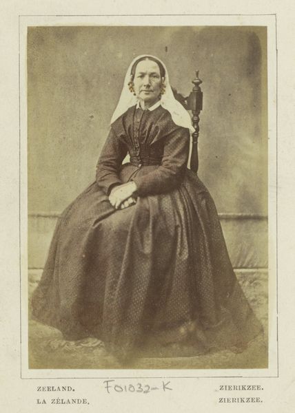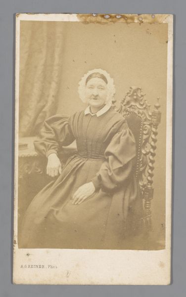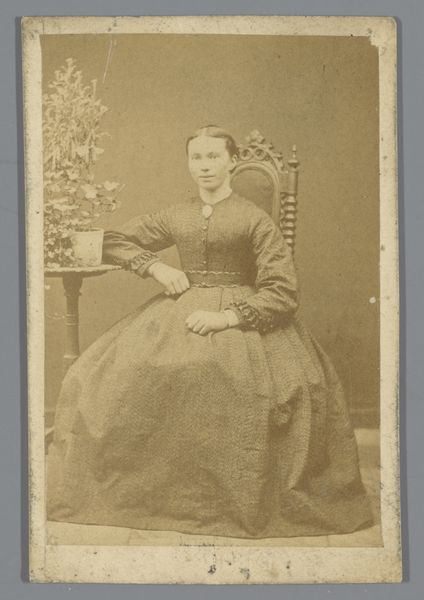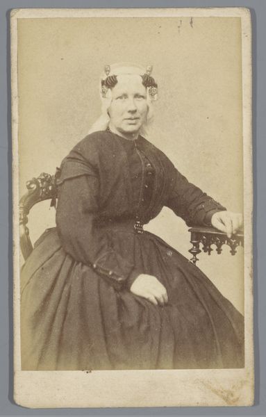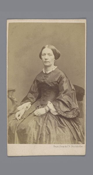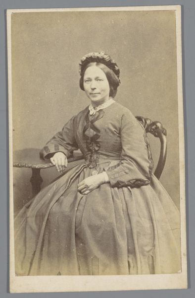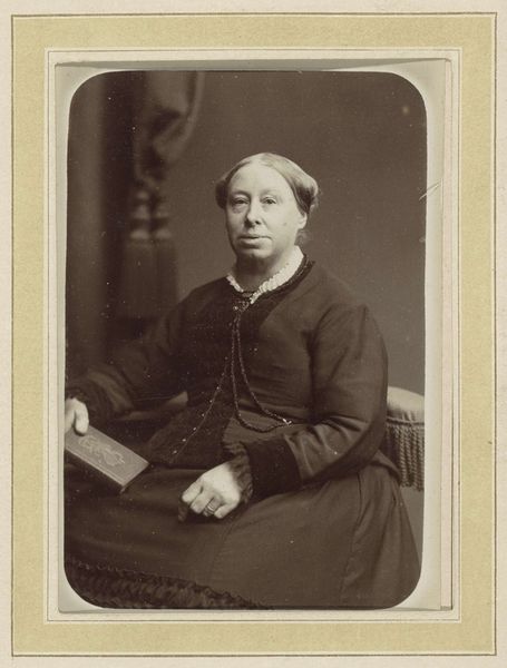 Curator: This captivating portrait, simply titled "Portret van een onbekende zittende vrouw met een boek in haar hand," was captured by Carl Jacob Malmberg sometime between 1861 and 1870. The medium is a gelatin-silver print, a common photographic process of that era. What are your immediate thoughts on it? Editor: The tonality strikes me first—a limited range of sepia that feels restrained. The composition is similarly formal, with the subject posed frontally and rigidly. Her hand holding the book and another resting over it feel quite unnatural, don't they? Curator: Perhaps. Consider the restrictions placed upon women during that period and how the expectation of primness and reserve can almost literally weigh on the body. Here, the woman holds a book. We can ask questions about female literacy and social roles in the mid-19th century. Was education and the literary realm one way for women to gain status or even challenge their position? And the "unknown" sitter invites considerations of class and access. Who was considered important enough to document and remember? Editor: While your socio-historical perspective is definitely crucial, let’s focus on her garments and accessories, on this plain dark garment, contrasted with a high-necked white collar. The material appears to be thick and substantial, absorbing much of the light. The only shimmer comes from a thin wedding band on her right ring finger. Curator: It speaks volumes. In marriage, a woman was both supported and constrained, legally subsumed under her husband. She may also be of some wealth, based on her attire and accessories, a woman able to indulge in books, photographs. Yet her name, her individual identity, is lost to us. That's a significant act of erasure that tells its own story. The portrait makes one wonder what her story really was beyond just another wife. Editor: Yes, precisely. And by limiting the range of tones and controlling the light so precisely, the photographer reduces visual noise and forces our eye onto these very sartorial signifiers that point to a very certain social stratum. The very design emphasizes constraint and control. Curator: An interesting thought about this composition that truly captures so much, on paper medium. A valuable reflection on the intricate relation of sitter and society that gives much to think about even 150 years later. Editor: A tight analysis shows an elegant visual economy—an intriguing play of surface and depth. The subject and her accoutrements become symbolic of that era, offering great food for thought for today's beholder.
