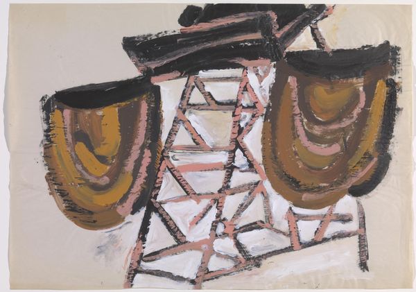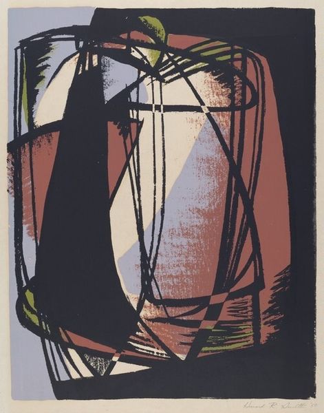 Curator: This is Peter Lanyon’s "Cane Chair," currently residing in the Tate Collections. What strikes you initially? Editor: The bold color palette! Those vibrant greens and blues—they create an immediate, energetic impression. It feels… optimistic, despite the abstract form. Curator: Lanyon, who lived from 1918 to 1964, was deeply embedded in the St. Ives art scene, a community exploring abstraction and its place in post-war British identity. Editor: I see how the simplification of form, the almost brutal application of color, moves away from representation toward pure visual sensation. The lines have a life of their own. Curator: Precisely. Lanyon was exploring the psychological landscapes of interior spaces, reflecting on the relationship between domesticity and artistic expression. Editor: I am intrigued by how the composition plays with perspective, almost challenging the viewer to reconcile the different planes and depths, and that is what makes this artwork memorable! Curator: Yes, it leaves us pondering the interplay of the personal and the public, inside and outside. Editor: A vibrant, albeit fragmented, look into Lanyon's vision.