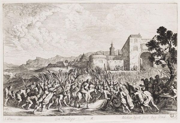 Curator: This is Gérard Audran's "The Saving of the Infant Pyrrhus," a striking plate measuring about 73 by 47 centimeters, currently residing at the Harvard Art Museums. Editor: The figures are so tense, almost theatrical. The composition, though, feels a bit staged, doesn't it? All the figures are directed on a single plane. Curator: Audran, like many artists of his era, was deeply invested in depicting virtue and leadership. Pyrrhus, saved as an infant, would become a celebrated leader in ancient Epirus. Editor: The rushing men, the overthrown figure in the foreground – they all suggest turmoil. Is that a broken shield? What does it symbolize? Is it the collapse of power, or the chaos of transition? Curator: Indeed. I think we can read the shield as a symbol of shattered authority, a visual cue to the precarious political landscape Pyrrhus was born into. It heightens the stakes of his rescue. Editor: It's fascinating how the visual language of this era could imbue even seemingly simple objects with such loaded significance. It truly invites reflection on the cyclical nature of power.