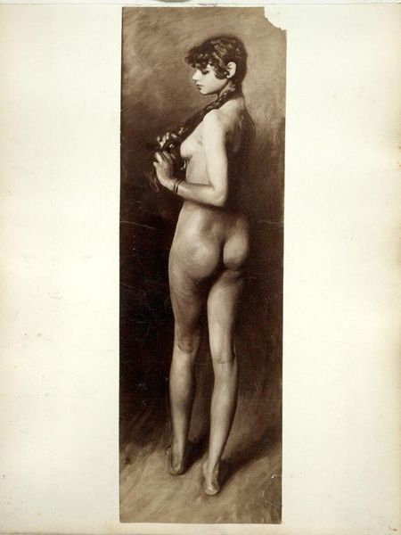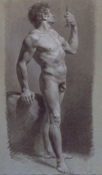 Curator: The work before us, "Nude front male with disc" created by Mariano Fortuny Marsal in 1861, utilizes charcoal to capture a striking full figure study. Editor: My first impression is the palpable tension in his stance. The slight contrapposto creates a sense of controlled energy, like he’s a coiled spring waiting to be released. The shading also contributes to this dramatic effect. Curator: Indeed, that tension is significant. Nude studies like this, particularly during the academic art period, were critical to represent ideal forms. It is no coincidence that he clutches that baton - not so much a sporting item, but rather the ancient Greek discus - associating the athletic male with the glories of antiquity. It signifies a reach towards perfection. Editor: But how does the choice to render the figure nude, holding the "disc", intersect with broader discussions about the male gaze, especially in 19th-century European art? His expression seems detached. Is he performing an ideal for someone? Curator: It is interesting that the model is seemingly detached. This isn’t necessarily a sensual celebration of the body. Instead, his face suggests an internal preoccupation - the pursuit of intellectual or artistic fulfillment, a kind of melancholy perhaps indicative of the burdens that accompany beauty. It reminds me a little of images of Greek heroes searching or longing. Editor: The use of charcoal definitely lends an almost ghostly, ethereal quality to his physique. In examining such a powerful, dominating pose it makes one question whether we consider its potential implications within gender power dynamics throughout history. Are we, even now, buying into a specific vision of masculinity? Curator: I am fascinated that the cultural memory of this image, the hero-athlete as both beautiful and emotionally complicated, persists despite shifting social landscapes. The charcoal medium adds to the romantic sensibility, yet this is also very realistic in capturing musculature, down to small skin imperfections. The symbol has staying power even if the interpretation shifts across different eyes and times. Editor: This drawing leaves me thinking about how art perpetuates ideals and ideologies and how it has helped inform power relationships, and whether that is even possible to completely change. The subtle rebellion could be through questioning itself - art that is simultaneously classical yet also somewhat 'modern'. Curator: For me, it’s a reminder of the enduring power of symbols, and how they continue to resonate and trigger unexpected emotional responses. This is despite being created within a specific historical context that is not the viewer's.