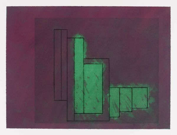 Curator: Looking at this untitled piece by Robyn Denny in the Tate collection, I’m struck by its use of solid colour blocks. It's quite arresting, isn’t it? Editor: Arresting, certainly. The large field of purple creates an immediate sense of calm, almost meditative, before the eye then encounters the blocky geometric form. The composition is quite simple, but undeniably effective. Curator: Denny’s work often engaged with the socio-political context of post-war Britain, reflecting the optimism of urban planning and the rise of consumer culture. Do you see that here? Editor: Perhaps. But I’m more drawn to the interplay of the colours, the tension between the expansive purple and the contained, almost architectural, green. It's not just social commentary; it's a formal exercise in visual language. Curator: I agree, there's a definite visual puzzle here. The artwork clearly invites closer inspection of its design elements. Editor: Absolutely. And ultimately, I feel that the simplicity of these forms and colours creates a surprisingly compelling viewing experience.