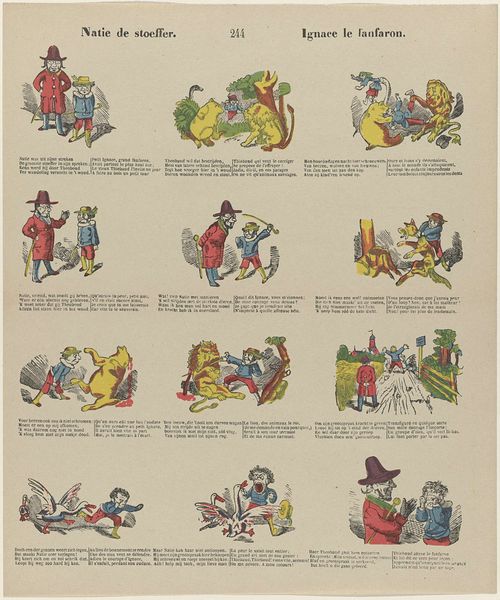 Curator: Let's delve into "De honigdieven / Les voleirs de miel," created sometime between 1833 and 1911 by Brepols & Dierckx zoon, held at the Rijksmuseum. It’s a watercolor that strikes me as an early form of comic strip, each panel a moment in a playful narrative. How might you interpret the significance of such imagery existing within a museum context? Editor: It’s interesting. I guess, immediately, I see a critique of authority, right? Like, are these "honey thieves" actually victims of the prevailing social structures? Curator: Exactly. Examining it historically, printed imagery like this circulated widely, contributing to a visual culture available beyond the elite. The "politics of imagery" is central: How does the production of these comic strips participate in shaping moral and social values for the emerging middle class? Was humor and visual storytelling used to reinforce or subvert societal norms? Editor: So, you're saying that a piece like this gains importance from understanding its circulation? That its historical reception is part of its significance, as well as the artwork itself. Curator: Precisely. Consider how the choice of watercolor, its easy reproduction, played into the piece’s wide dispersal. It wasn't just about the content, but also about accessibility. And today, its display within the Rijksmuseum raises interesting questions. What happens when such accessible art enters these institutional walls? How is its narrative and its politics of imagery changed? Editor: It really reframes what’s considered valuable or “museum-worthy.” I hadn't thought about art history including the social impact *of* art production, too. Curator: Indeed! These unassuming pieces were key in establishing modern modes of visual storytelling.