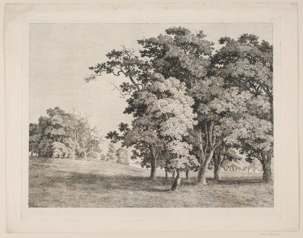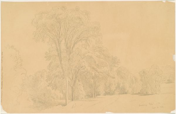 Curator: This is Dankvart Dreyer's pencil drawing, dating back to the 1840s, called 'Et skovløberhus, ved siden af et mægtigt egetræ', or 'A forester's house beside a mighty oak'. It resides here at the SMK. What catches your eye about it? Editor: It has this ghostly stillness to it. The delicate pencil work gives the whole scene a dreamlike quality, as if it’s a memory fading away. Curator: Dreyer’s landscape drawings were deeply influenced by his engagement with the rural and agrarian life. Look at the density of marks representing the trees, particularly the oak, contrasted with the simple geometry of the forester's house. We can read the paper itself as the land, the means to a productive economy in 19th Century Denmark. Editor: Absolutely, and that imposing oak is far from the kind of disposable commodity or material you describe. Its got such a palpable presence, hasn’t it? I can almost feel its rough bark beneath my fingertips, a beautiful counterpoint to the cottage's straight lines. It brings such soul and a little whimsy. Curator: But consider the role of the forester. His labour, his management of timber— the drawing positions the natural within a system of social and economic order. Even what we might call 'soul' serves a purpose. Editor: Perhaps. Or perhaps Dreyer was just as bewitched by nature as the rest of us. To render a tree with this much detail shows something akin to love, doesn’t it? A dialogue through labor perhaps? I get that feeling. Curator: A productive reading! Thinking about the material conditions—the role of drawing as both record and study, as preparation for painting, gives the “dialogue” you refer to a deeper art historical significance that brings more to the final paintings of the artist. Editor: Well, regardless of what he was trying to convey, he certainly captured the serene spirit of the landscape. It just whispers of old forests and quiet days. Thank you, Dankvart! Curator: Indeed. It’s in these unassuming drawings we locate much wider discussions on labor, and nature’s place in societal infrastructure that so powerfully shaped Dreyer’s broader artistic output. Thank you for taking this journey with me.