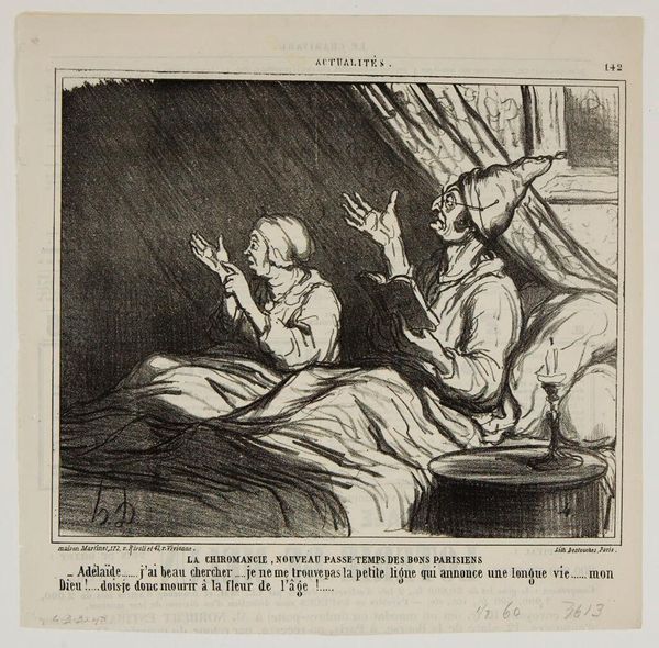 Editor: This is Honoré Daumier's "Making Sure There Isn't a Fenian Under His Bed." I find the dark, scratchy lines give it a very anxious feel. What can you tell me about this work? Curator: This print speaks volumes about the social anxieties of the time. The "Fenian" refers to members of the Irish Republican Brotherhood, and anti-Irish sentiment was rampant. Daumier cleverly critiques the irrational fear and prejudice directed at this group, portraying the man's exaggerated precautions as almost comical. Editor: So, it's less about the actual threat and more about the societal paranoia? Curator: Precisely. Daumier is holding a mirror to the absurdity of xenophobia and the construction of "the other." It's a powerful statement, even today. Editor: That definitely reframes how I see the image. Thanks! Curator: My pleasure. It’s vital to consider art as a reflection of its sociopolitical context.