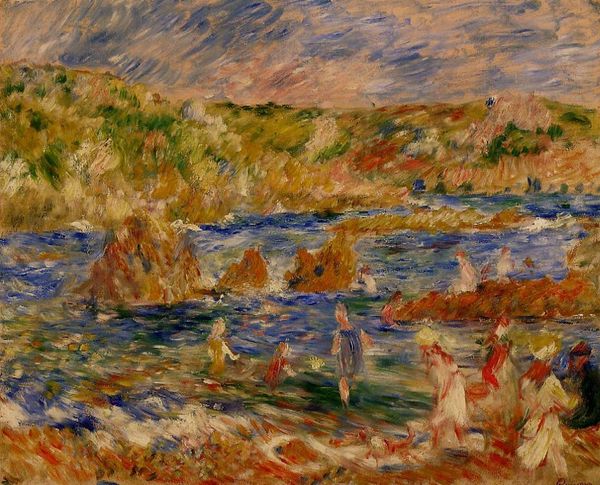Maurice Prendergast made this watercolour, The Cove, on paper, at an unknown date. What I love about Prendergast is his embrace of the accidental, the blot, the drip, the happy little accident, as Bob Ross would say. You can see how the colours mingle and bleed into each other, creating a sense of atmosphere and movement. The materiality of the paint itself is also interesting. It's thin and transparent in some areas, allowing the white of the paper to shine through, and then in other areas, it's thicker and more opaque, creating a sense of depth and texture. If you look closely at the figures in the foreground, you can see how Prendergast uses quick, gestural marks to suggest their forms and movements. It's almost like he's capturing a fleeting moment in time, a snapshot of life in motion. This piece reminds me of Bonnard, another artist who was interested in capturing the ephemeral qualities of light and colour. Ultimately, I think Prendergast's work is about embracing the messiness and ambiguity of life, and finding beauty in the unexpected.