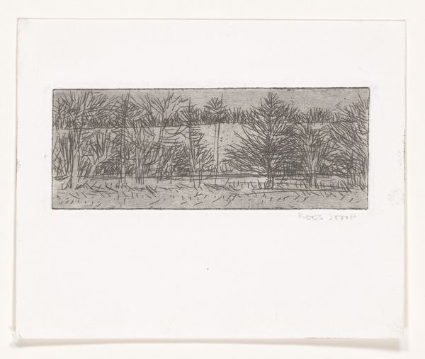 Editor: This etching, titled "Schutting" by Kees Stoop, is a detailed landscape scene, rendered in an almost miniature scale. It’s quite intricate; I’m immediately drawn to the textures created by the etching lines. How do you interpret this work? Curator: The first thing that grabs my attention is the clear division between the man-made and the organic: the fence and foliage. What's interesting is thinking about Stoop's choice of etching. This method necessitates a physical process, applying acid to a plate, then printing, that connects the artist to the landscape via labor. Editor: That makes sense. It is a really hands-on process. How does this process impact the consumption or our perception of this artwork? Curator: Well, knowing it's an etching changes the value proposition, doesn't it? It's not just an image but also a trace of physical actions, suggesting that even the simplest landscape requires human intervention and labor to both create and be represented. Are we meant to consider Stoop's labor in observing this seemingly "simple" landscape? Editor: I suppose it does highlight the relationship between the artist, the material, and the depicted scene. I had been only considering the depicted landscape without thinking about Stoop's contribution to it! Curator: Exactly. The piece serves as a powerful reminder that artistic expression is as much about the material process as it is about aesthetic ideals or capturing of scenery. Editor: I learned something new about interpreting art by paying attention to the physical and historical context in the making of this work, which I'll certainly apply in my future work. Thanks! Curator: Absolutely! And that the choice of medium affects the content that is transmitted.