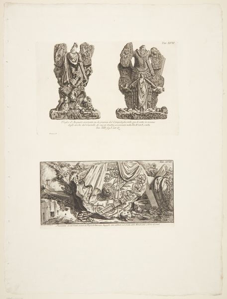 Curator: At first glance, this engraving strikes me as quite imposing, almost overwhelmingly detailed. It's packed with figures and symbols, creating a sense of grandeur and formality. Editor: Here at the Rijksmuseum we have a print made in 1691 by Romeyn de Hooghe called "Beelden, deviezen, emblemen en andere schilderijen op de triomfbogen voor het Buitenhof, 1691", which translates to something along the lines of "Images, Devices, Emblems and Other Paintings on the Triumphal Arches for the Buitenhof." Curator: Triumphal arches, yes, very common display of power, I see Baroque theatricality employed in its presentation as it shows the imagery prepared for a state event. The multiple tiers of the design give a structured order, yet it overflows with information that really puts in question how a person could easily absorb this at first. Editor: Absolutely. De Hooghe captures not just images but an entire symbolic language prevalent at the time. Take, for example, the figures at the very top - are those allegorical representations of virtues or perhaps personifications of power related to the Dutch Republic? I'm immediately curious about each iconographical choice. What does each gesture and item that each holds in its hand suggest about the values and the political messages being promoted? Curator: Knowing De Hooghe's reputation, I imagine these triumphal arches served not just to celebrate but also to project an ideal of Dutch authority. The historical context is key here. The Dutch Republic was navigating shifting alliances and persistent international challenges at the time. The placement of images for a public such as that one for Buitenhof reinforces an ideological purpose and message from the event. Editor: It speaks to the power of visual propaganda in that moment as we continue to witness today in contemporary society through diverse visual means. What lasting impact would you say that this image has contributed in shaping social and cultural discourse? Curator: That’s a great point to consider, for the political culture and its ability to be disseminated across diverse audiences at such a pivotal moment of international engagement. This reveals layers about the performative and persuasive capacity that Baroque provides that shapes and influences discourse that is seen through a specific narrative in history. Editor: And for me, the beauty resides precisely there: discovering those narratives encoded within the very fabric of the artwork, which will undoubtedly transform each person who stops to behold such artwork through the lens that the author so much wants us to interpret.