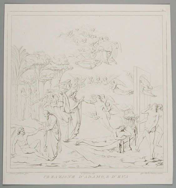 Curator: This is Giovanni Paolo Lasinio's rendering of the East Door of the Baptistery of Florence, seemingly capturing Moses receiving the law on Mount Sinai. It's all lines and light, isn't it? Editor: It feels unfinished somehow, like a ghostly echo of a grand narrative. But I can also see it as a commentary on power and authority. Look at the crowd below, their forced subservience. Curator: Yes, the line work does make it a bit detached, doesn't it? More about the idea of law than the feeling of faith, maybe. Editor: And whose law are we really talking about? This image is definitely complicit with the ways religious narratives have been historically deployed to maintain the status quo. Curator: I suppose that the artist, rather than the commissioner, ultimately dictates the final meaning of the artwork. Even when constrained to a specific subject, the hand still holds the pen, right? Editor: True, the artist's intention still filters through, even if the work is still ultimately constrained and conditioned by power structures. Curator: Well, it has given me a lot to consider about faith, power, and art. Editor: It definitely offers a lens through which we can see how images perpetuate ideology.