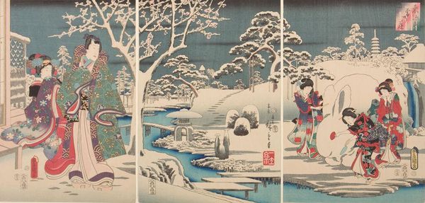 Editor: I feel instantly calmer just looking at this. It’s like a hazy summer afternoon by the water… a gentle, almost melancholy feeling. Curator: Indeed. What we have here is “Women Near a River,” a captivating woodblock print triptych by Utagawa Kuniyoshi, created sometime between 1840 and 1860. Editor: Triptych, so three panels together, right? It's a generous panoramic view of what seems like three moments by the river – almost like a freeze-frame of a film scene. The colors are muted, mostly blues and grays... subtle. Curator: Exactly. And consider Utagawa’s role within the late Edo period. His work engaged with, and at times subtly critiqued, the prescribed roles of women in public and domestic spaces. Are these women pausing during their daily tasks? Are they on leisure, perhaps constrained by the gaze? Editor: That makes sense… because I was also picking up on a quiet tension. They are all turned away in different angles and wearing these gloriously patterned kimonos, almost disguising themselves against the landscape… But each with her unique gesture. Like a little code or visual poem. Curator: The positioning is key. The arrangement and layering of these women are very telling for sure, also note how their clothing obscures yet reveals aspects of their class status. It’s an art form speaking volumes about the hidden narratives that construct identity within those settings. What this artwork does particularly well is allowing us space to think about gendered identities within rapidly transforming public spheres. Editor: Absolutely! Plus, just from an artist’s perspective, the craftsmanship involved is breathtaking. Imagining carving all that detail into wood... and the way the light plays with all those delicate lines. There’s such intentionality, I could look at this all day and still discover something new. Curator: I agree. We also should situate our perspective within current issues that intersect art and identity, asking ourselves what Utagawa would've said now. Editor: Definitely food for thought… Thank you for these details. I leave with a whole new appreciation of it now. Curator: It's my pleasure. Hopefully our brief chat helps bring further context.