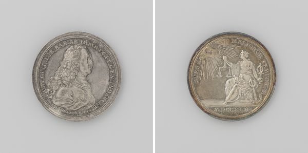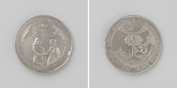 Editor: We're looking at a metal relief sculpture entitled "Ontzet van Wenen door Leopold I," which translates to "Relief of Vienna by Leopold I" from 1683 by Anton Meybusch. It’s interesting how two distinct scenes can exist on such a small coin. What compositional choices strike you in this piece? Curator: Notice how Meybusch employs circular form, containing both the regal portrait of Leopold I and a dynamic battle scene within this singular, enclosed space. The portrait, meticulously detailed, contrasts starkly with the densely packed, almost chaotic representation of the battle. This deliberate contrast underscores the individual power versus the collective action of war. Do you observe anything interesting about the lines used? Editor: Yes, the lines in Leopold’s portrait are very smooth, especially when compared to the lines in the battle scene where there is so much angular energy. I noticed there’s also text around the border of each side, how do you see this framing adding to the overall composition? Curator: Precisely. The inscriptions serve not merely as labels, but as integral visual elements. Their circular arrangement echoes the form of the medal itself, further binding the portrait and battle scene into a cohesive unit. Consider how this circular text directs the viewer’s eye, compelling them to engage with every element of the composition in a structured manner. It functions almost like a frame within a frame, intensifying our focus on the depicted imagery. What feelings do you have while observing this medal? Editor: I am intrigued how the contrast in styles used forces your eye between each scene but it does feel very unified. I didn’t even consider the text as a formal element but now realize how vital it is for compositional integrity. Thanks for your input! Curator: It is in studying the composition of historical work such as this where the essence of semiotics and structure become apparent.