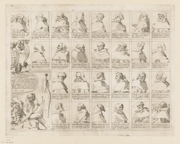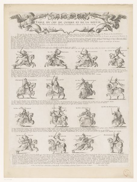 Curator: Editor: We are looking at “Wapenschilden en helmen”, which translates to “Coats of Arms and Helmets,” an engraving and etching from 1647 by Samuel Bernard, housed in the Rijksmuseum. I find the intricate details mesmerizing. How would you begin to interpret such a piece? Curator: Well, first, isn't it incredible that something created nearly 400 years ago can still speak to us? For me, this print feels like peering into a secret language, a codified system of status and lineage. It’s like the artist is inviting us into a world governed by symbols. What do you make of that overwhelming amount of information and detail? Editor: I do find it rather dense and somewhat intimidating! Are we meant to read it like a historical document? Curator: In a way, yes, though I see it more as a cultural artifact reflecting the social structure of the 17th century. Bernard meticulously presents a hierarchy through these coats of arms and helmets, each element telling a story, often of power, ancestry and allegiance. I can almost feel the weight of tradition embedded in those swirling lines! Does that change how you look at it? Editor: Absolutely, understanding it as a reflection of societal structure brings a new dimension. It’s no longer just an overwhelming visual, but a structured representation of a world I’m only beginning to understand. The fact that these very precise systems existed... amazing. Curator: Precisely! And perhaps a little comical as well. What I find rather striking is to think of who it was speaking to, its intended audience – that little group of elites in on the “secret”. Does that invite other interpretations to mind, knowing that bit? Editor: It definitely shifts my perspective. I was so focused on the image itself, now I realize there’s an entire world *around* the image that's just as important. Thanks, I'll never look at heraldry the same way.
