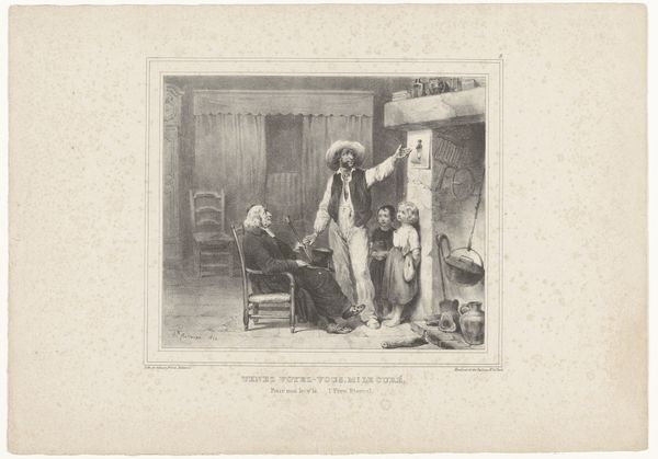 Editor: This is "Danske kunstnere i Rom," or "Danish Artists in Rome," made in the 1880s by Adolph Kittendorff. It's a print – lithograph and etching – and it gives the impression of observing a casual, almost intimate scene. What initially jumps out at you when you look at it? Curator: The wonderful contrast of shadow and light. The men bathed in light, conversing at the window as others sit within the shadows…it whispers stories, doesn't it? Like a play unfolding in slow motion. You almost expect someone to deliver a wry, witty line. This piece makes me ponder artistic communities – what was it like to gather, share dreams and struggles, far away from home? Can you imagine yourself in that room, blending into the shadows, observing, creating? Editor: Definitely, there’s this whole world contained in that single room. It also makes me think about artistic influence – were they intentionally fostering a kind of 'artist colony' vibe to support and inspire each other? Curator: Precisely! Rome was the artistic epicenter in the 19th century; Kittendorff captures this longing, this draw to something greater than themselves. Look at the details - a sculpture in the background, dog resting on a chair... a little slice of bohemian life. How might that sense of "exile," or maybe freedom, fuel their artistic fire, do you think? Editor: I hadn't thought of it that way, the ‘exile’ as an energizing experience! So it’s not just a slice of life, but also maybe a search for artistic identity? Curator: Absolutely, an etching filled with potential stories and inspiration! That’s the beauty of art, it sparks the imagination, doesn't it? Editor: It does. Now, looking at it again, I feel a strong sense of… kinship. Thanks for sharing that!