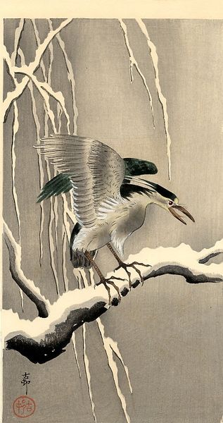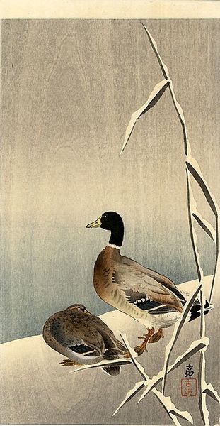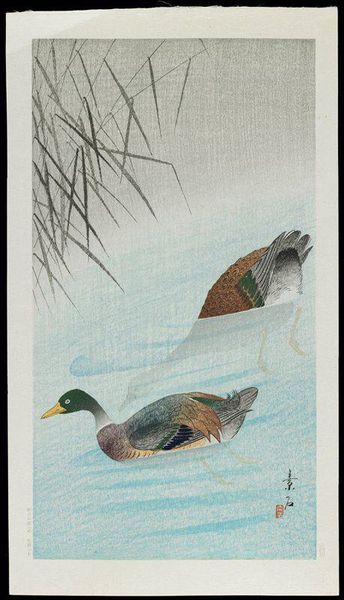 Editor: This woodblock print, "Goose on the Snow" by Ohara Koson, really strikes me. The texture of the goose's feathers seems almost tangible against the smooth, gray background. What draws your eye when you look at this piece? Curator: For me, it's about the materials and the process. The woodblock printmaking tradition itself speaks volumes about the intersection of art and craft. How does the labour involved in carving and printing these blocks inform our understanding of the image? We have to ask questions of the socio-economic system too - who was buying these prints, and how were they distributed? Were they luxury items, or accessible to a wider audience? The way that color is used, so economically, what does this restraint mean? Editor: That's fascinating! I hadn't considered the economic aspect. So, you're suggesting the materiality of the woodblock and the socio-economic system within which it exists really change the meaning? Curator: Precisely. It is very interesting to note the rise of ukiyo-e prints, and how artists began using materials, processes, and distribution methods that challenged traditional artistic boundaries and catered to an emerging merchant class. What materials were most available, affordable? That's a question we should be asking as art appreciators. Editor: So, it's not just about the goose, but the goose *and* the system that allowed this print to be created and consumed. Curator: Exactly. The image is intrinsically linked to its means of production and the society in which it circulates. Understanding these factors adds depth to our appreciation. It isn't the ‘timeless’ work so often considered by other scholars of the arts. Editor: I’ll definitely look at woodblock prints differently now. I appreciate this different take. Thank you! Curator: It’s essential to remember art never exists in a vacuum, and material conditions matter just as much as symbolic meaning!