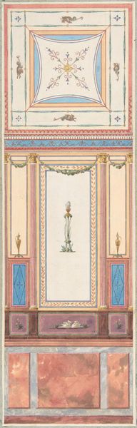 Curator: This watercolor and ink drawing, entitled "Design for an Alcove," was created by Giuseppe Valeriani between 1735 and 1745. Editor: Immediately, I see theatricality. It has the air of a stage set, rendered in these wonderfully muted colors, almost a dreamlike vision of opulence. Curator: The architectural structure, those precise columns and ornate detailing, certainly convey Baroque extravagance. It is almost as if the viewer is being presented with a scene ready for performance. Editor: Absolutely. The drapery itself suggests a secret about to be revealed, doesn't it? We are clearly dealing with a space of importance. Draped textiles were of enormous significance, suggesting luxury, status, power... Curator: Indeed. Note the repetition of the arched form throughout—the alcove itself, echoed by the curves of the decorative elements. See, too, how Valeriani utilizes a limited color palette to control the spatial composition? Editor: Yes, it all points to an enclosure, to somewhere separate. Perhaps, as a stage set, it's a place of transformation, or, as a domestic setting, a zone of private significance, somewhere reserved only for family, for retreat from outside gazes? Curator: Observe the classical busts flanking the draped opening; these, positioned like guardians, impart not only formality but allude to intellect, to the presence of thoughtful endeavor within. The architecture isn't merely a decoration but almost a framing device. Editor: I'm drawn to the way the sketch captures not only physical features, but offers a glimpse into the mentality of that period - a taste for theater and controlled perspectives within intimate, domestic arrangements. The alcove serves almost as a memory palace where emotion meets restraint. Curator: A compelling interpretation. This exercise in perspective captures both the grandeur and controlled intimacy of Baroque design. Editor: An apt visualization of spaces created for privileged vision. Thanks to the artist’s careful touch with the colors and his controlled hand, even a simple space exudes luxury.