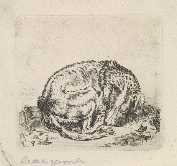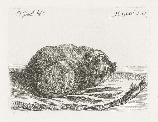 Editor: This etching, "Slapende hond, liggend op een deken," or "Sleeping Dog Lying on a Blanket," created in 1851 by Jacobus Cornelis Gaal, has a comforting, intimate feel. The detail in the dog's fur is remarkable, and it really captures the animal's vulnerability. What do you see in this piece, particularly regarding its place within art history? Curator: The choice of subject is really interesting for the period. In the mid-19th century, artistic focus began to shift toward more everyday subjects, mirroring the rise of realism. The dog, in its unidealized, domestic state, signals this move. Consider how paintings of grand historical scenes, symbols of power and national identity, were giving way to more intimate, relatable subjects, and thus reshaping artistic institutions. Does this challenge older academic hierarchies, would you say? Editor: Absolutely, depicting a humble scene like this pushes back against the grand narratives of the time, especially those championed by the established art academies. This feels like a turn inward, towards personal experience. Curator: Exactly. And think about who the audience for such works might be. As a print, it would have had wider distribution than an oil painting, democratizing art and making it accessible to a growing middle class. It creates a space for personal reflection within a burgeoning consumer culture. How might the rising middle class identify with a comfortable domestic animal? Editor: It's fascinating to think about how this simple image connects to such broad social and economic shifts. I initially saw just a charming scene, but I now recognize it's speaking to wider issues of access and class in the art world. Curator: Precisely! It shows how even seemingly simple artworks can act as powerful mirrors reflecting complex societal changes, particularly the evolving role of art itself. Editor: Thanks so much. Now I’m wondering what other hidden layers I have missed in this exhibition.