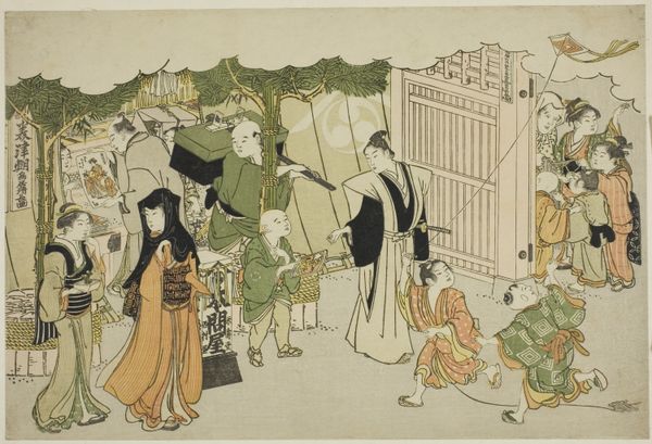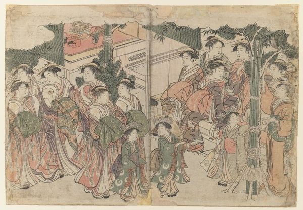 Curator: Good morning. I am delighted to introduce you to Torii Kiyonaga's print, “The First Garments of the New Year,” also known as “Kiso hajime,” from the illustrated book "Colors of the Triple Dawn.” Created around 1787, this beautiful work resides here at the Art Institute of Chicago and is a stunning example of ukiyo-e artistry. Editor: It’s instantly engaging! There's such a delicate and ephemeral feel to the scene. The light palette gives it a sense of grace and perhaps, fleeting joy. The figures almost seem to float across the paper, clad in the most incredible fabrics! Curator: Indeed. As a genre painting, this ukiyo-e print captures a vibrant snapshot of the social customs and rituals of the era, with a particular focus on women. Note the exquisite details of their kimono— the layers, the patterns—reflecting social status and the aesthetics of the period. Kiyonaga had a great understanding of female beauty ideals within Edo society. Editor: I love how each woman holds her own personality, despite the artistic conventions of beauty. They appear caught in mid-conversation. What narrative is embedded here? It all feels so poised, elegant and also...staged? Like we're catching a performance or public ritual. Curator: That tension you perceive, I think it points to how such images were constructed and consumed within the cultural and social spheres of the time. Ukiyo-e prints circulated widely, so this scene certainly performed a role beyond the merely descriptive, presenting idealised images for public view. It likely shaped the perception of women and celebration in Japan. Editor: You know, stepping back I love the lack of depth. That compressed picture plane pushes the scene right up against the viewer! The stylized shapes, patterns and rhythmic gestures add to that sense of theatricality too. I wonder, if this image had more depth if that would add or detract from it? I feel like the answer to this question rests on who or what this art was made for, wouldn't you agree? Curator: I agree entirely, an exciting thing to consider. Looking closer, it's clear the setting—marked by the bamboo decoration—indicates this "first garments" tradition happens indoors. Note too, how the setting frames and contains them as social beings. It all prompts many thoughts regarding the intersections of public, private, tradition, and modernity! Editor: This artwork leaves me buzzing with questions, doesn't it you? Now I wish I could just float among these lovely kimono-clad women. To think, what new adventures and new threads they'd weave for themselves next!