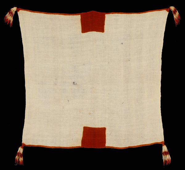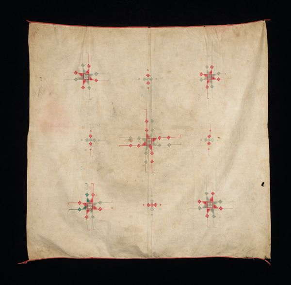 Curator: This striking textile work, “Pillow top Insert,” dates back to around 1940 and invites an immediate consideration of folk art traditions. Editor: I am captivated by its directness. The figure's angularity, its naive geometry—it gives the piece a powerful, elemental presence. The artist had such command of shape, creating form from color blocking, the layering creates depth from flat materials. Curator: And what shapes those forms is, most obviously, a depiction of a male figure in military attire. Given the date, this could signal something about wartime craft and how representations of masculinity become intertwined with national identity, constructed and deconstructed through domestic skills like sewing. Editor: You highlight the importance of time and identity while the artistic focus stays with composition, the careful balancing of the central panel against its borders, that's no small feat in an artwork like this. There’s a delightful interplay between rigid, vertical lines of his form and the subtle textural variations within the fabrics used, adding nuance without disrupting the initial visual impact. Curator: Exactly, considering the intersections between personal and political textiles gives agency to traditionally dismissed domestic practices—empowering craft as a means of preserving folk culture, challenging established hierarchies within the artistic canon. Think about whose stories get told and how. Editor: Interesting to see, how the folk artist manages to extract and recombine those principles into a distinct, highly effective symbolic language, communicating narratives on an intimate level. There is an immediacy, in the limited color range and graphic-like simplicity, a quality almost entirely removed from typical gallery art practices of the era. Curator: In that way, it defies its domestic setting, becoming an intervention. These objects tell of lives otherwise untold; histories interwoven within each stitch. And it's not just a piece of cloth, it’s a conduit—a tangible representation of resilience, heritage, and the narratives carried forward through generations. Editor: Thank you, I see its emotional dimensions now. It holds and shows so much more than mere surface texture. Curator: And, I admire its technical qualities even more. The artist skillfully transformed fabric and thread into this important object.