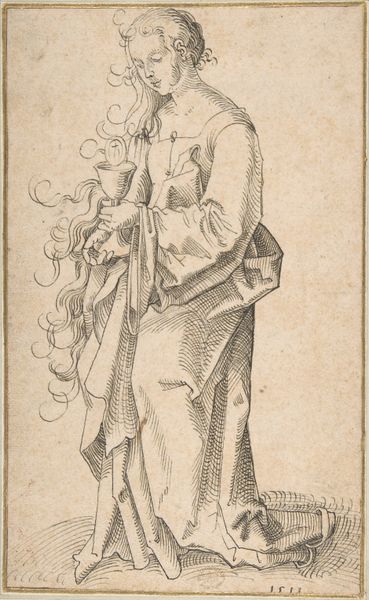 This print depicts a standing figure with a hat and a jug and was created anonymously. The figure, possibly a woman, is adorned in what appears to be a turban-like hat with a veil, a long dress, and soft slippers. What does it mean to witness a depiction of a woman from an anonymous hand? The figure carries a jug, a symbol of nourishment. Consider this: whose stories are told, and who remains unnamed in the annals of history? The act of standing, of being upright, carries connotations of strength. Yet, the soft lines and delicate etching render a feeling of vulnerability. There is a negotiation in the details of representation, a balance of power and erasure. This print asks us to contemplate the narratives embedded in anonymity, and to acknowledge the silent voices that contribute to the historical narrative.