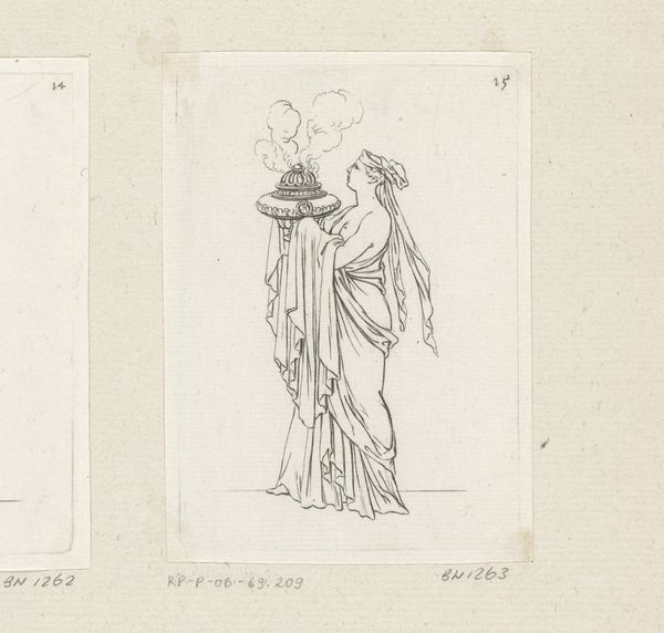 Sébastien Leclerc I made this drawing of a man with a helmet and field sign using pen and paper in the 17th or 18th century. The linear quality of the pen strokes defines the form, and the cross-hatching provides depth and tone. The artist demonstrates skill in controlling the flow of ink to create fine lines and subtle gradations, giving the figure a sense of movement and volume, despite the limitations of the monochrome medium. However, the drawing's graphic nature lends itself to reproduction. This was an era of growing print culture, and Leclerc, as an engraver, was deeply involved in this. The drawing is not just an end in itself, but could well have been a study for a print, intended for wide distribution. This context is crucial for understanding the artwork's purpose, reaching a broader audience.
