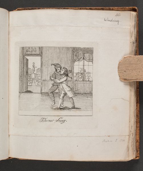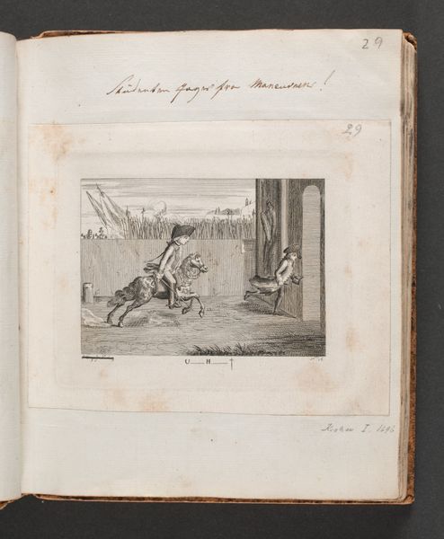 This anonymous etching titled "Poleti i Borgergaden 1798", captures a stark scene with precise lines on a small scale. The composition, dominated by a rearing horse and figures in mid-action, evokes a sense of disruption within the structured environment of the street. The artist’s use of line is particularly striking. It not only defines form but also conveys movement and tension. The cobblestone street, the rigid architecture, and the chaotic interplay between humans, animals, and space all contribute to the artwork's dynamic. We can consider how the artist's choice of this medium influences our perception. The etching technique allows for a clarity that renders the scene with a sense of immediacy, while the linear detail invites a deeper reading into the social dynamics. Ultimately, the rigid structure of the architectural forms is juxtaposed against the violent scene. This creates tension, and perhaps aims to destabilize our understanding of order and control in the urban environment. Art is never truly resolved. It remains open to interpretation and questioning.