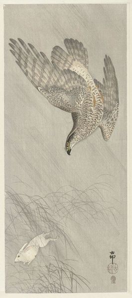This woodblock print, Hunting Hawk, was created by Ohara Koson sometime between the late 19th and early 20th century. Look at the hawk diving head first towards it's prey. You can feel the motion and the speed in the diagonal lines and the bird's wings that are outstretched. The textures here are so delicate; you can almost feel the softness of the hawk's feathers. The limited color palette, mostly greys and whites, gives the print a subtle, almost ethereal quality. See how the artist uses tiny lines to create the illusion of texture? The details in the feathers are so finely rendered they seem to vibrate on the page. Koson's work has a real kinship with the earlier prints of Hokusai, who similarly captured the wonder of the natural world, proving that art is really just an ongoing conversation.