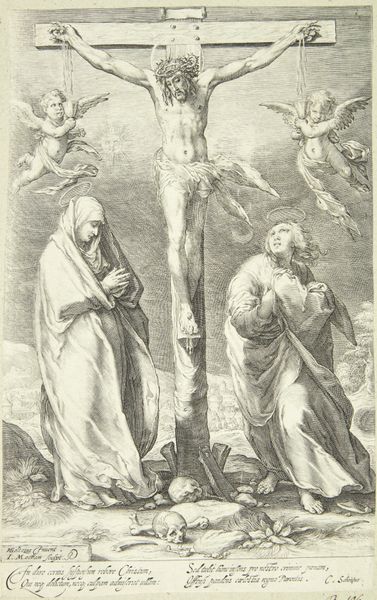 This is Pieter Maes’s "Crucifixion of Christ," made sometime in the 16th century. It’s an engraving, meaning the image was incised into a metal plate, probably copper. The artist would have used a tool called a burin to cut lines into the surface, creating grooves that hold ink. Consider the labor involved. Each line had to be carefully planned and executed. The varying depth and density of the lines create the illusion of light and shadow, and give form to the figures and landscape. It’s a time-consuming process, requiring considerable skill and patience. And it’s also a process of reproduction. Once the plate is made, multiple impressions can be printed. This speaks to the social context of the time. Prints made religious imagery more widely accessible, contributing to the spread of religious ideas and devotion. By understanding the material and making of the engraving, we gain insight into its cultural significance, beyond the image represented.