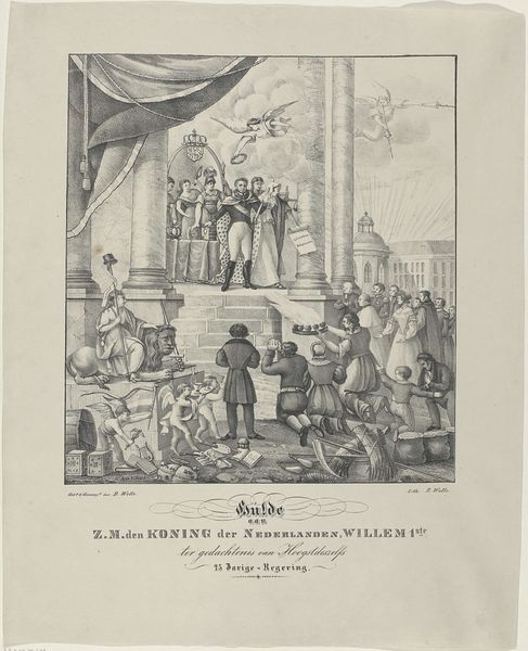 Eugène de Loose created this print, Allegorie op de eensgezindheid van de Belgen bij de opstand, in 1830, using the technique of engraving. Engraving is an intaglio process, where the image is incised into a metal plate, which is then inked and printed. In this case, the matrix was probably made of copper. It is a labor-intensive process. The quality of the engraved lines determines the image’s details, from the lion at the top of the pillar to the crowd rejoicing below. The linear quality of the engraving emphasizes the graphic nature of the print, contributing to its documentary feel. But the crisp, clear imagery also belies the hard work that went into its making. The act of cutting the lines into the metal plate, in reverse, and then printing them, demands skill and precision. This artisanal labor stands in contrast to the industrial context depicted - the Belgian Revolution – a shift in the relationship between labor and politics. Ultimately, it is the artist's hand and the engraver's skill that bring this historical moment to life, underscoring the value of craft in shaping our understanding of history.