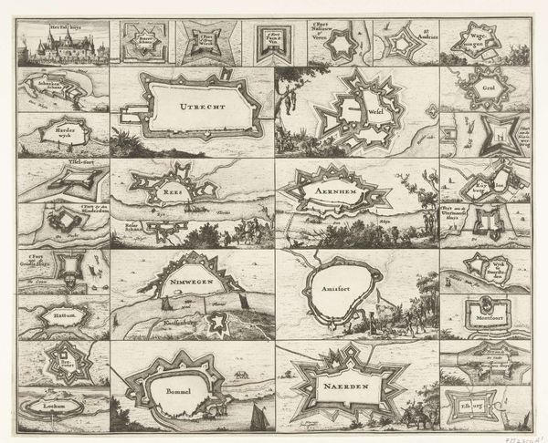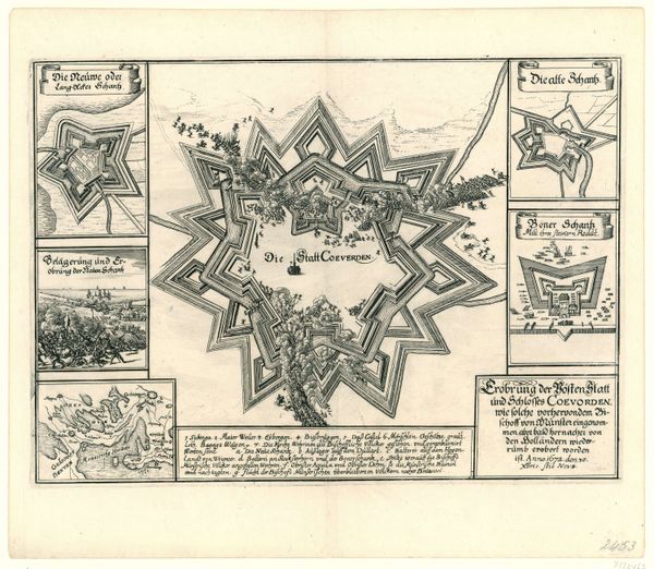Editor: Here we have Romeyn de Hooghe’s 1673 engraving, "Overwinningen van Rabenhaupt in Groningen in de jaren 1672-1673," housed at the Rijksmuseum. What immediately strikes me is the intricate geometric structure, almost like a puzzle of different scenes and maps within a larger ornamental frame. What are your initial thoughts on the piece? Curator: Indeed, the dominant geometric arrangement, particularly the prominent star-shaped fortress at the center, commands attention. Consider the line work itself, the density of the hatching, and how that articulates space and depth. Are there any relationships that you can see between the visual space of the typography, ornamentation, cartography and historical record? Editor: Well, it seems the layout guides your eye to certain key points - the sieges are illustrated as smaller vignettes around a star fort and surrounding land. The typography gives the title weight, but there are many smaller instances of text as well, that, with ornamentation, help break the print into distinct compartments. Does this strict adherence to geometric form help establish the meaning? Curator: Precisely. The star fortresses were meticulously engineered, which made it more resistant to cannon fire than older curtain wall fortifications. De Hooghe isn’t merely depicting a historical event, but also showcasing the sophisticated technological advancements of the time. Observe how each distinct panel contains varying degrees of hatching to communicate visual weight. What is communicated by the negative space? Editor: That's fascinating, I hadn't considered the role of technology in the art's composition itself. Thinking about the negative space and use of white in the image emphasizes the precision of these fortifications, almost glorifying military efficiency and a new age of engineering. Curator: It seems like there is some relation between Dutch painting genres of the 17th century, like landscape painting, and how the content in the frame relates to one another as an image of the territory under conflict. A strategic and well executed arrangement. Editor: I see how formal elements here create new and unexpected readings when considered under your framework, rather than merely illustrations or a set of coordinates in a map. Curator: By focusing on form, we revealed how the artwork transcends a mere historical document, becoming a commentary on its time.