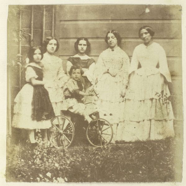 Curator: This is a fascinating albumen print from 1858 by John Constantine Stanley. It’s titled “[Countess Canning with Guests, Government House, Allahabad].” What strikes you initially about the composition? Editor: The sepia tones immediately create a sense of history, almost a faded memory. I'm drawn to the contrasting textures – the billowing fabric of the dresses versus the solid, classical column. Curator: Precisely. Stanley captured Countess Canning, a prominent figure in British India, receiving guests at Government House. Consider the power dynamics inherent in such a scene, visualized here in a colonial setting. The countess's very pose is indicative of her social rank. Editor: I notice the subtle nuances of light and shadow. Look at the folds in her dress and the man's bow tie in the background. The composition is less about capturing detail than creating depth and form, almost evoking a theatrical staging of social hierarchy. The composition makes effective use of vertical and horizontal lines that seem to convey some measure of order or hierarchy. Curator: Exactly. Photography at the time was often used as a tool to legitimize colonial power, a visual testament to British presence and authority. Images like these circulated widely, shaping perceptions back in Britain. Editor: Note the rather romantic framing of a portrait, enhanced by soft tonal qualities and slightly blurred lines. Yet there is something inherently restrained, even in its attempt at visual opulence, reflecting perhaps, the photographic limitations of its time. Curator: Good point. While Stanley was crafting an image of grandeur, technological constraints impacted representation. Also think of the labor required to produce a single photograph. Editor: And that very labor reinforces the statement: This photograph operates as both documentation and cultural artefact. I keep returning to the geometric relationships formed by the group: the vertical lines of the column mirroring the stiff poses. Curator: Absolutely. By subtly orchestrating light, form and figures Stanley provides insight into how colonial authority projected itself. What began for you as faded memory becomes more potent document. Editor: Indeed. Analyzing it closely gives insight into photographic artistry and British Imperialism.