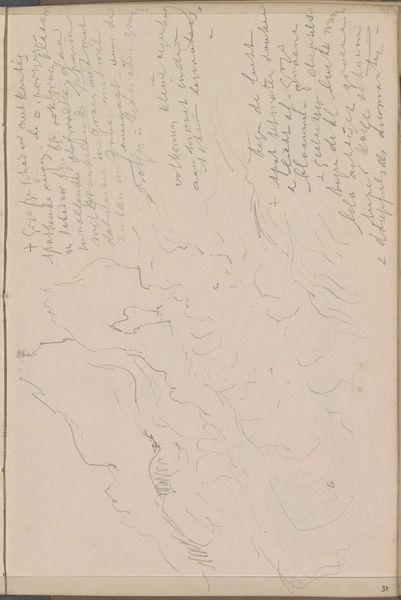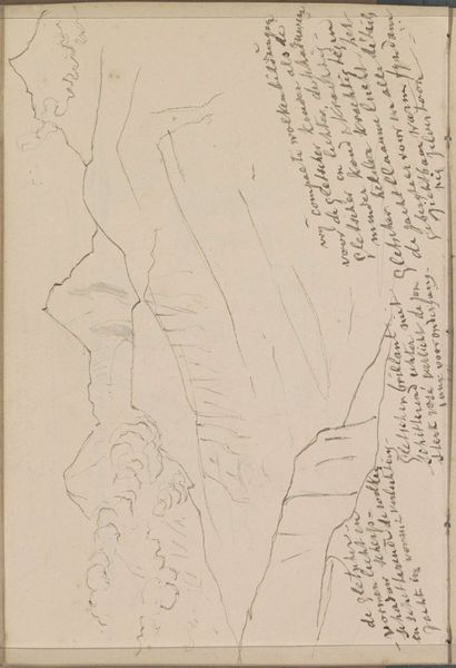 Editor: So, this is "Jannes opgang van de Kleine Scheidegg" by Johannes Tavenraat, made around 1858-1859. It's a pencil drawing on paper and part of the Rijksmuseum collection. Looking at the stark, almost scribbled lines of the mountain range, it feels very much like a quickly captured impression. What strikes you most when you look at it? Curator: What I find fascinating is how this simple sketch, a seemingly quick study, whispers volumes about the Romantic era's obsession with nature's grandeur. Tavenraat doesn't present us with a polished landscape, does he? Instead, we get raw, untamed emotion—a feeling more than a view. It’s as if he is saying: behold this place, sense its spirit and might. Do you get that from those hesitant, yet bold lines? Editor: Yes, absolutely! There's a kind of vulnerability to it. But, is it finished, do you think? It feels so immediate and sketch-like. Curator: Exactly. Think of it like a musical phrase—the start of something, pregnant with possibility, even without all the notes. It may have served as the groundwork for something else or been complete in its feeling, like a poem left open ended. I bet this captures the exact feeling he was looking for at the top! Editor: I see, it captures the essence without needing to be a finished piece. Thanks, I never thought of art that way before! Curator: And now, I've learned something from you, too - how openness in art speaks even louder sometimes.