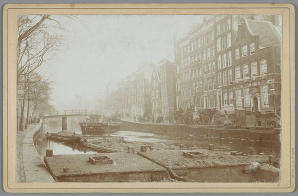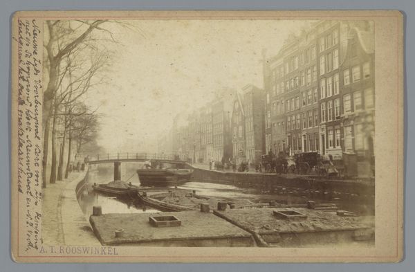 Curator: Let's discuss this fascinating gelatin-silver print, "Gezicht op de Warmoesgracht te Amsterdam" by Andreas Theodorus Rooswinkel. It was taken sometime between 1850 and 1894. Editor: It evokes such a somber mood, doesn't it? The sepia tones lend this melancholic feel, while the repetition of the buildings, trees and reflections creates a really strong composition. Curator: The printing process is crucial to understanding its appeal. Gelatin-silver prints like this allowed for mass production of images, opening up photography to a much wider audience. Think of it as democratizing image-making, moving it away from the elite portrait studios. Editor: It’s incredible to see Amsterdam so clearly represented through the repeating patterns of the gabled facades and arching trees, while water dominates. The reflections mirroring the solid forms give the canal such weight and stillness. Does it point toward any symbolic interpretation here, especially as the image freezes everyday activity on its edges? Curator: I’d say the image highlights Amsterdam as a trade center. You can observe a figure maneuvering a barge beneath a bridge, while numerous workers transport heavy looking loads alongside the canal. Its rigid geometrical and perspectival design speaks volumes of industry in Dutch life at this time. The canal wasn’t just picturesque; it was the lifeblood of commerce. Editor: That commerce brought new cultural symbols as well. What appears initially as a somewhat neutral depiction of a waterway shows human activities. Curator: And it’s vital to note that photographs such as this circulated widely. They contributed to constructing and shaping the Dutch identity, and the global image of the Netherlands as industrious. Editor: The photograph definitely reflects back at me something fundamental, as that kind of commercial, civic visual identity still marks Amsterdam today. Curator: Indeed. It serves as a tangible reminder of the social forces and means of production that shape a city. Editor: So from process to symbolism, both shape this view of Amsterdam and what the canal tells us about its era.