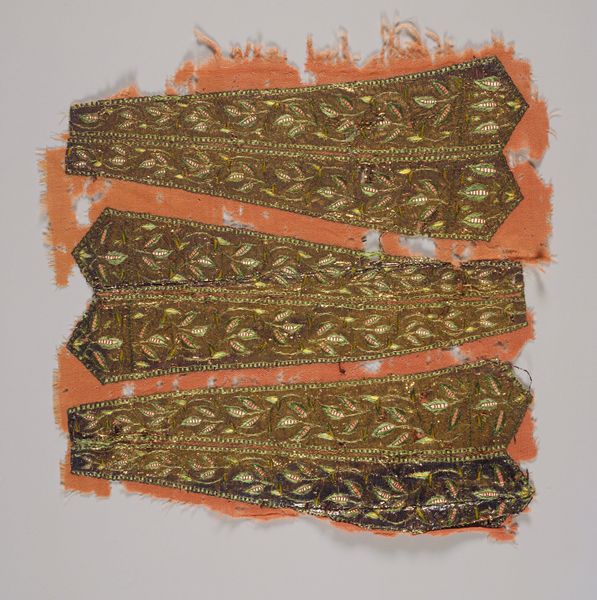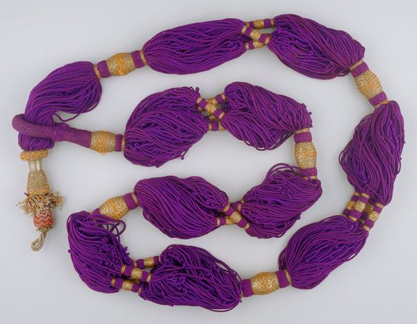 Editor: This decorative textile, entitled "Sleeve Guard," is attributed to an anonymous artist and dates from the late 19th to early 20th century. It’s made of silk fibre and is part of the decorative arts collection here. It reminds me of an elaborate curtain tieback. What elements of its construction stand out to you? Curator: Notice the piece’s inherent tension between linearity and mass. The predominantly horizontal orientation created by the string of tasselled units is juxtaposed against the sheer volume and dimensionality of the bundled and braided silk. There is a complex interplay of visual weight as your eyes travel across the different segments of yellow and hints of red. Editor: Can you say more about "visual weight?" Curator: Consider the relative density within the structural components of each bundle; the weight then fluctuates between tightly-wound sections of fibre against expanses of freely draping thread. The repeating interval generates rhythm but consider how the internal tension prevents pure pattern-making. The eye can neither relax into perfect symmetry, nor lose itself within chaos. Editor: That’s fascinating. The variation in texture and density creates an active visual experience that really holds your attention. Curator: Indeed. While it functions as a 'sleeve guard' the pure ornamental form carries considerable expressive heft on its own formal terms. How does the repetitive rhythm contrast with the irregularities within the embellishments themselves? It might tell a more expansive tale on the tensions between form and function. Editor: I see that now. It makes me consider adornment not just as surface decoration, but as a dynamic element in itself. Thanks for pointing that out!