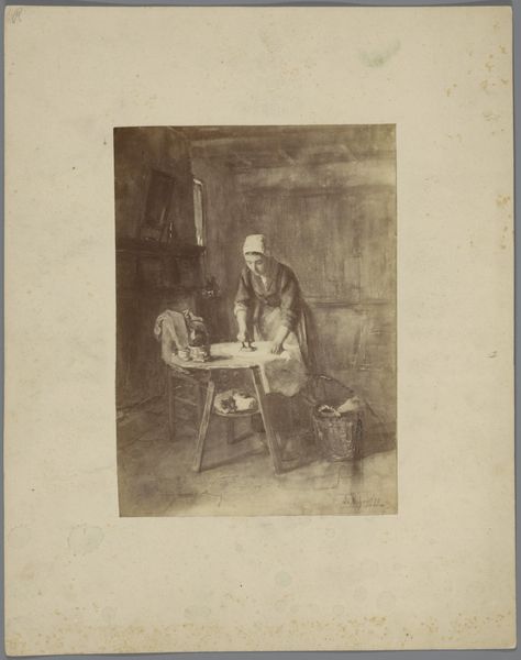 This is an anonymous photograph of a painting by Albert Neuhuys, its date is unknown. Neuhuys was part of the Hague School, a group of Dutch realist painters active in the late 19th century. This image captures a woman in what looks like traditional Dutch clothing, seated and focused on what appears to be needlework, perhaps mending clothes. Her posture and the soft light evoke a sense of quiet domesticity, a common theme in genre painting of the time which often romanticized rural life. What does it mean to capture the intimate labor of women, turning it into an object of aesthetic contemplation? It's interesting to consider how such images reinforced certain social roles and expectations for women, particularly within the context of a rapidly industrializing society where traditional ways of life were increasingly idealized. While seemingly benign, these representations participated in shaping societal perceptions of gender, labor, and class.