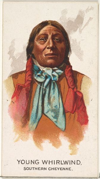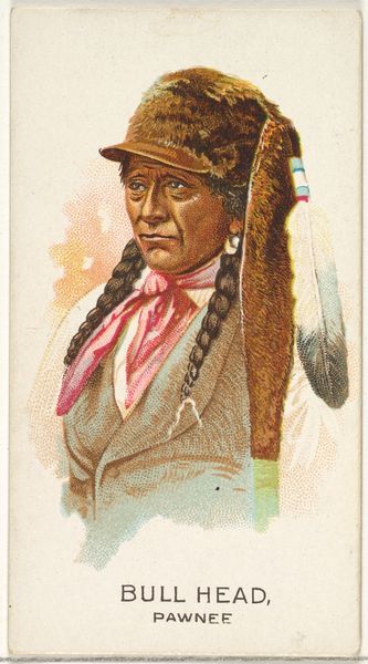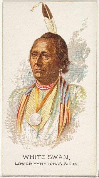 Editor: This is “Mad Bear, Lower Yanktonas Sioux,” a drawing from 1888 by Allen & Ginter, part of their American Indian Chiefs series, rendered with colored pencils. The subject's gaze is very direct. What visual elements stand out to you, and how do you read this portrait? Curator: Observe how the artist structures the composition within the confined space of this trading card. The figure's head occupies a significant portion, drawing our attention to the facial features and expression. Note the layering of the figure against a simplified background, this creates depth while maintaining a flattened picture plane. Editor: It's interesting that you point out the use of limited space, like Ukiyo-e, or other Asian printmaking formats, since those were clearly trending during this era. Is the artist making a deliberate formal choice in using color or texture? Curator: Certainly. The application of color, particularly in the rendering of skin tone and the red neckerchief, is carefully considered. The artist is creating visual interest through contrasts and texture through layering. How do these visual elements affect your interpretation of the subject? Editor: I think it adds an exotic touch. It's easy to think of this and other depictions of Native Americans at the time as purely ethnographic, but this composition shows artistic invention. Curator: Precisely. By focusing on these visual components, we move beyond simplistic readings of representation and towards an understanding of artistic agency at play. It urges one to look deeper than just a document of appearance. Editor: I see now that the beauty of this work resides not just in *what* is depicted, but in *how* it is depicted. It allows for a more critical look into Allen & Ginter and their artistic process. Curator: Agreed, recognizing how structure, texture and layering shapes our understanding.